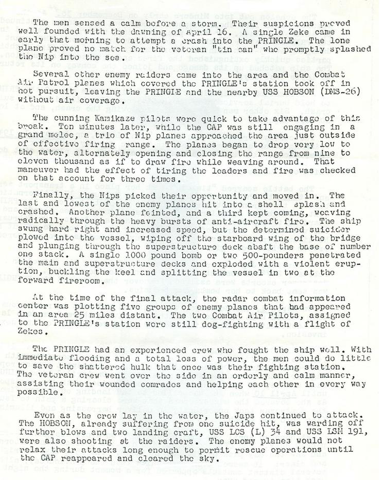 Below are pages of the USS Pringle Action Reports pertaining to the sinking (starting with the last paragraph on pg 5 and through pg 7. The full seven pages of action reports from the Navy can be found here.