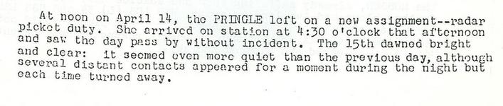 On 16 Apr 45, the USS Pringle was patrolling Radar Pickett Station #14